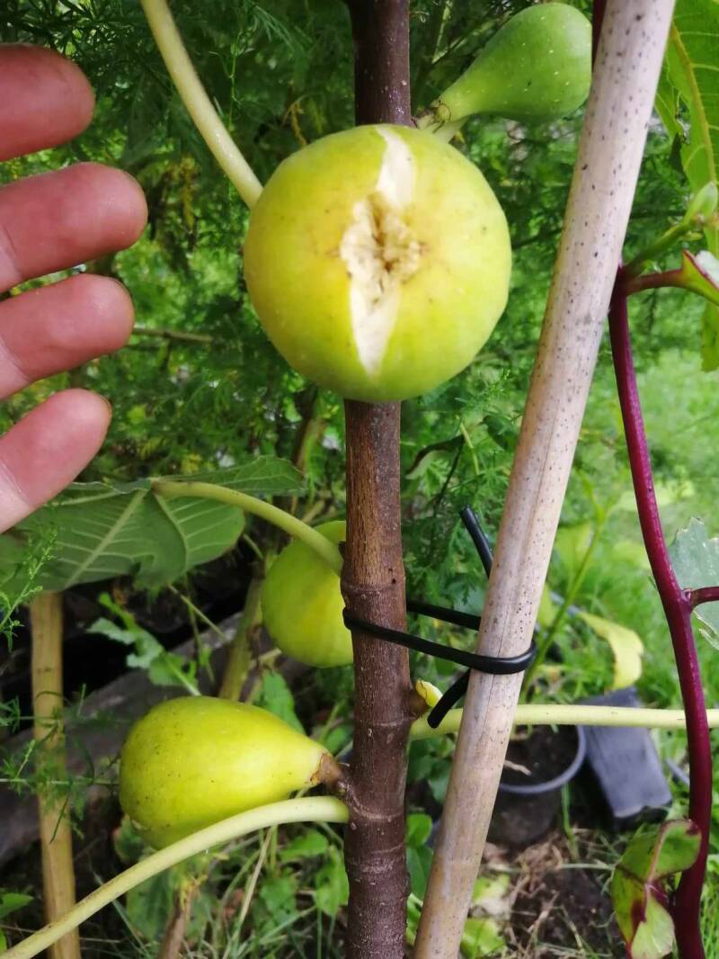 Gisteren voor het eerst eens mogen proeven van de vijg 'Sancta Maria'. Het is een geel/groene vijg. De vrucht binnenin heeft een wat gelige kleur, maar wat een zoete smaak! Niet de mooiste wat de kleur betreft, maar dus zeker wel als je van lekker zoet houdt. De moederplant staat nog wel in een grote pot. Ook hebben we al een aantal 'Sancta Maria' vijgen opgepot. Deze zijn klaar ter adoptie.